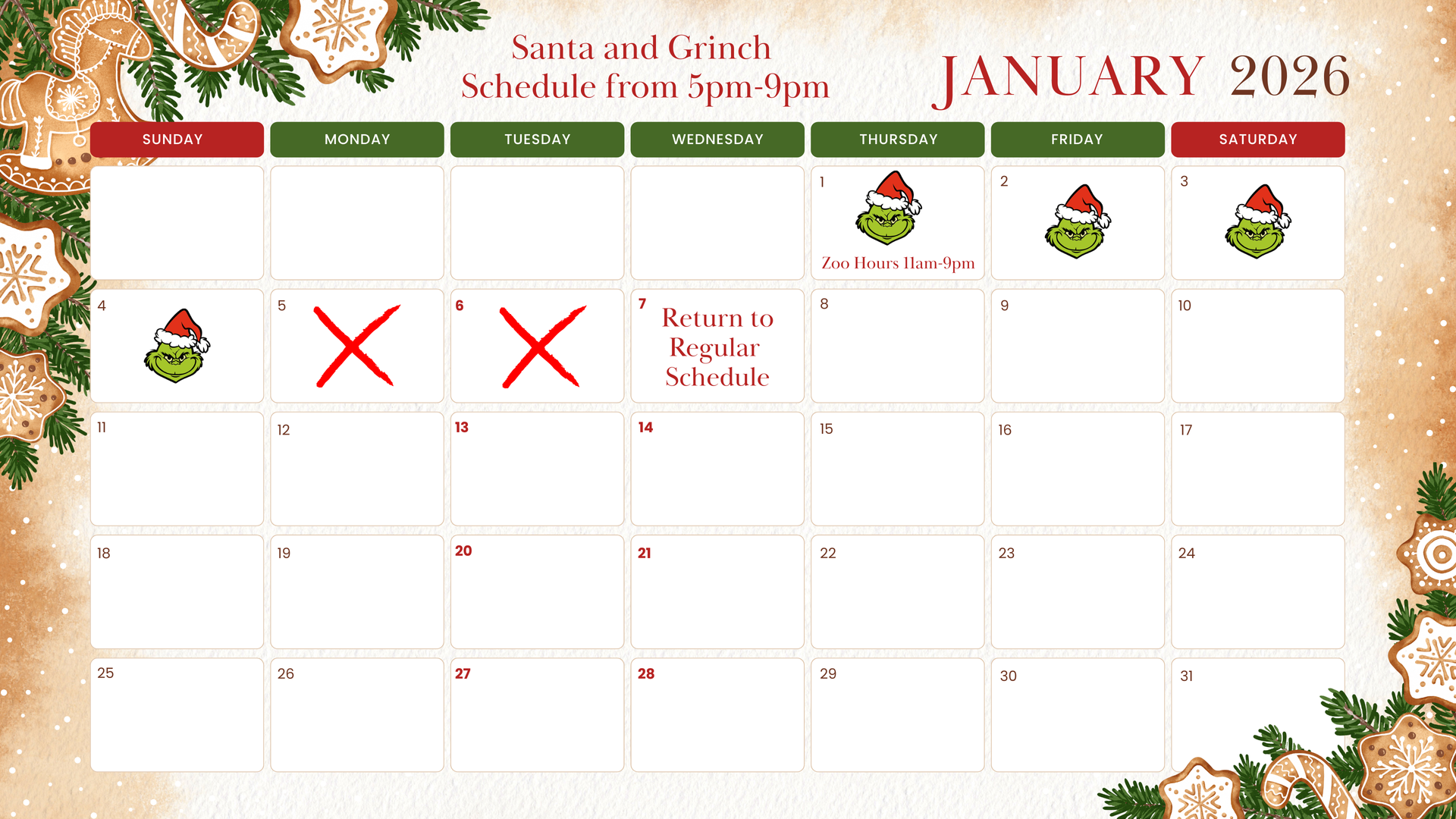 Photos with Santa and the Grinch from 5pm-9pm. December 1st Zoo Hours are 11am-9pm.